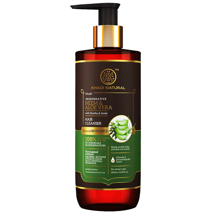 Khadi Naturals Neem & Aloe Vera Hair Cleanser Powered Botanics Khadi Naturals Neem & Aloe Vera Hair Cleanser Powered Botanics is blended with purifying neem and soothing aloe vera to create an excellent combination for cleansing and nourishing hair. Hair becomes smoother, more lustrous, and thicker from the roots with daily use.
