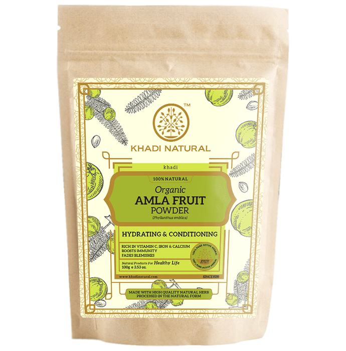 Khadi Naturals Organic Amla Fruit Powder Amla is popularly known as the Indian gooseberry and is an excellent source of vitamin C. It has potent antioxidants, helping the body to rejuvenate. It helps improve the quality of the skin, making it appear more radiant and youthful. It could increase the density of hair by increasing the speed of regrowth | Key Ingredients: Amla fruit | Key Benefits: Amla powder for skin helps to reduce lines, wrinkles, dark spots and acne problems to give you blemish-free youthful skin It helps to improve skin elasticity, removes dead skin cells and adds a natural glow to your skin Amla helps to condition the damaged hair and makes them glossy and damage-free Amla hair pack works as an excellent hair tonic that adds a natural shine to hair and keeps them straight by working directly on the hair follicles | Directions For Use: Use as directed on the label or as advised by your healthcare provider | Safety Information: Read the label carefully before use Store in a cool and dry place away from direct sunlight Keep out of reach of children