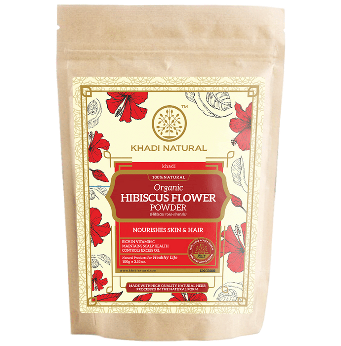 Khadi Naturals Organic Hibiscus Flower Powder Khadi Naturals Organic Hibiscus Flower Powder The brightly hued hibiscus flowers are rich in nutrients such as amino acids that are necessary for producing keratin, the building blocks of our hair. It is made from shade-dried fresh hibiscus flowers and can be used for multiple purposes for face, skin and hair care.