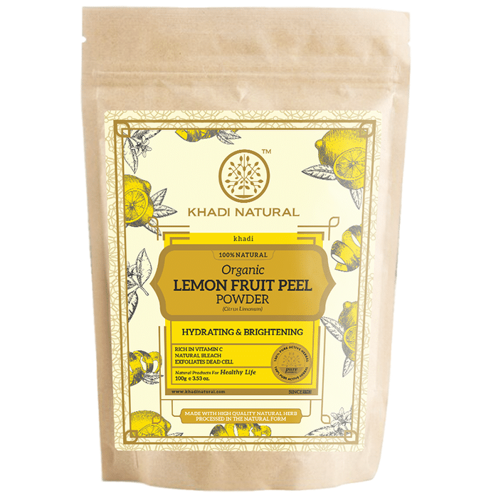 Khadi Naturals Organic Lemon Fruit Peel Powder It is a rich source of Vitamin C and works best on both skin and hair. It removes dark spots, scars and blemishes. The anti-bacterial and anti-microbial properties help in treating acne and oily skin. Acidity in lemon acts as a bleaching agent that assists to clear out marks and dark spots on the skin. | Key Ingredients: Leamon fruit peel | Key Benefits: Vitamin C enriched lemon peels nourish skin deeply and firmly Enhances skin radiance and removes toxic elements from skin Cleanses out all dirt and pollution from pores, purifying the skin It also helps with bursts out stubborn pimples, and acne from the face making it supple and soft | Directions For Use: Use as directed on the label or as advised by your healthcare provider | Safety Information: Read the label carefully before use Store in a cool and dry place away from direct sunlight Keep out of reach of children