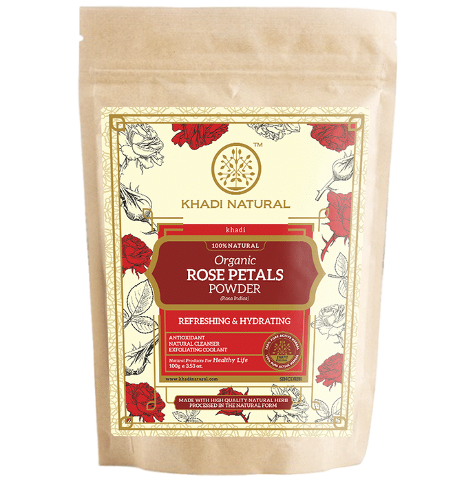 Khadi Naturals Organic Rose Petals Powder It acts as a coolant which helps reduce the appearance of signs of ageing and removes dirt from the surface of the skin. The antioxidant property in the rose powder reduces skin irritation and soothes skin. | Key Ingredients: Rose petals | Key Benefits: Provides relief for skin problems like allergies and acne It helps to get rid of bacteria due to its antibacterial properties Assist in rejuvenating the skin and fighting skin problems like allergies and acne The antioxidant property in the rose powder reduces skin irritation and soothes skin | Directions For Use: Use as directed on the label or as advised by your healthcare provider | Safety Information: Read the label carefully before use Store in a cool and dry place away from direct sunlight Keep out of reach of children