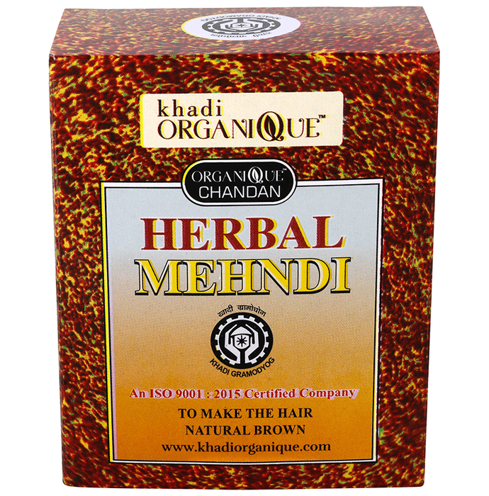 Khadi Organique Herbal Mehndi is a naturally formulated henna powder. It serves as an excellent hair conditioner and helps to promote healthy silky hair. It also increases the shine of the hair. | Key Ingredients: Mehndi Leaves Neem Leaves Amla Brahmi Bhringraj Tulsi Bhilawa Shikakai Methi Seeds | Key Benefits: The naturally obtained henna helps to promote hair health It serves as a natural coloring agent and alongside also acts as a natural conditioner for the hair The natural ingredients of the henna helps to soften the hair | Directions For Use: A night before application, soak the henna Powder in water overnight You can add beetroot juice to the mixture. Make sure you stir it well to avoid the formation of lumps Before applying, you can also add egg and lemon to the mixture and stir the mixture really well to form a homogenous paste Take small sections of your hair and apply the henna powder generously on the hair Leave for an hour or hour and a half, and wash off the paste properly Rinse your hair using a mild shampoo | Safety Information: Incase of allergic response, discontinue to use the product Read the label carefully before use Keep out of the reach of children Store in a cool dry place away from direct sunlight Any remains of the henna paste in the hair can cause itching and irritation. Therefore make sure to wash it off well