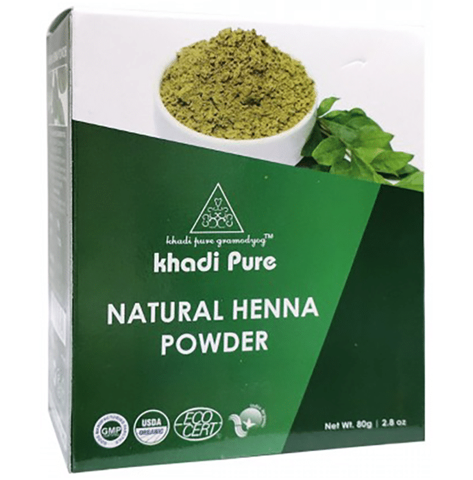 Khadi Pure Natural Henna Powder Khadi Pure Natural Henna Powder is excellent for keeping hair moisturised and conditioned. It is high in vitamin E, which softens the hair and promotes hair development with its antioxidant characteristics. It helps to prevent excessive hair loss, reduces premature hair greying, and gives the hair a natural colour.