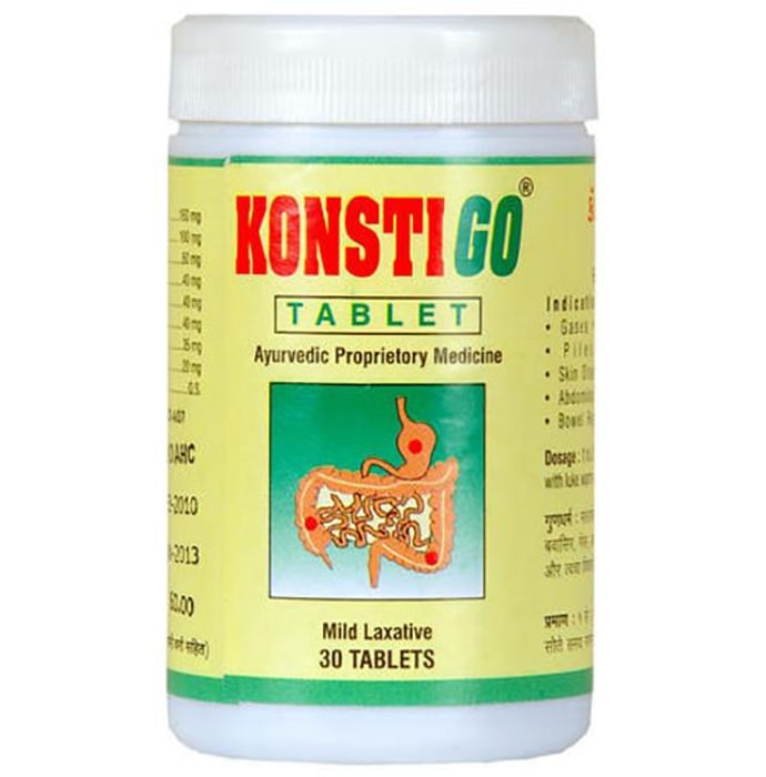 Konstigo Tablet contains Avipatikar Churna - 160 mg, Hing - 100 mg, Sendhav - 80 mg, Sonamukhi - 40 mg, Nishottar - 40 mg, Ajwain - 40 mg, Chirayata - 35 mg, and Indravani - 20 mg. Role of key ingredients: Avipatikar Churna is an ayurvedic formulation used for treating constipation. It also provides relief from acidity by neutralizing acid content in the stomach. Hing helps in curing indigestion. It also helps treat other digestion problems such as intestinal gas, upset stomach, irritable bowel syndrome (IBS), and irritable colon. Sendhav helps improves appetite, removes gas and provides relief from heartburn. Sonamukhi is a natural laxative used to treat constipation. It also helps treat irritable bowel syndrome. Nishottar is used as a laxative and is used to treat constipation and flatulence. Ajwain helps treat gastritis, constipation, stomach ache, indigestion and heaviness in the stomach. Chirayata is used for treating constipation, digestive complaints, heartburn, gastric ulcer and indigestion. Konstigo Tablet helps treat constipation, acidity, fissures, piles, indigestion, skin diseases, loss of appetite and abdominal discomfort. It also acts as a bowel regulator. Directions of use: Take one-two Konstigo Tablet orally with luke warm water before bed time. Use under medical supervision.