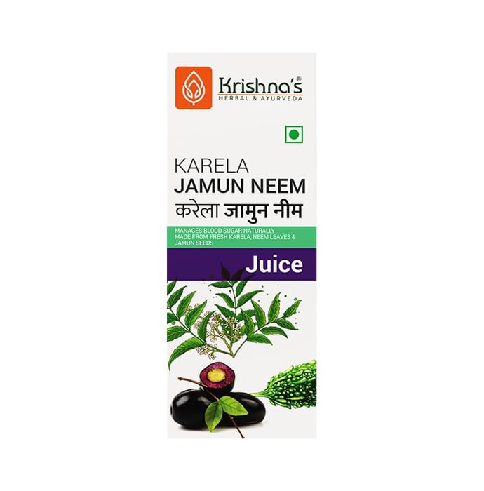 Krishna's Herbal & Ayurveda Karela Jamun Neem Juice Krishna's Herbal & Ayurveda Karela Jamun Neem Juice is an effective drink for diabetic patients. It controls the blood sugar level and offers multiple health benefits. It contains karela, enriched with vitamins and minerals and an antioxidant in nature. Jamun contains vitamin A and C and is also suitable for digestion. Neem is considered to have multiple positive effects on our body as it has antioxidant and anti-inflammatory properties in it. It helps purify your blood, enhances your immune system, and stimulates pancreas and liver functions. This juice is free of any chemicals and is made of only natural ingredients.