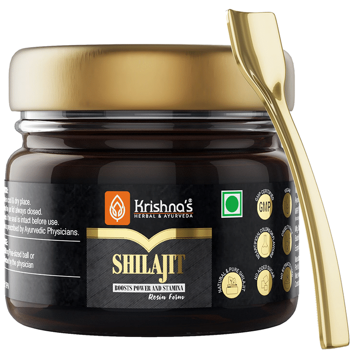Krishna's Herbal & Ayurveda Shilajit Resin Form is a herbo-mineral tar-like substance basically derived from high mountain rocks by the gradual decomposition of plants. Shilajit helps to balance all of the doshas in the body. It strengthens and rejuvenates the body. It has aphrodisiac properties which provide a one-shot solution for male health. It can be taken after meals to boost stamina and vigour. Shilajit is high in fulvic acid which protects the body from cellular damage. It regenerates cellular tissue that slows the ageing process. It eliminates tiredness, dizziness, shortness of breath, and aids with an irregular heartbeat. | Key Ingredients: Shilajit resin | Key Benefits: It revitalises the body, aids digestion, and improves mood It is aphrodisiac in nature and provides a one-shot male health solution It is high in fulvic acid, a powerful antioxidant and anti-inflammatory substance that protects the body from cellular damage It regenerates and restores tissue, resulting in a slower ageing process The optimum quantity of iron in the RBC restores balance, allowing regular oxygen flow It alleviates tiredness, dizziness, shortness of breath, skin pallor, and irregular heartbeat | Directions For Use: Mix a pea-sized amount with water and consume immediately. | Safety Information: Read the label carefully before use Store in a cool and dry place, away from sunlight Keep out of reach of children Check if the seal is intact or not Use as prescribed by ayurvedic physician