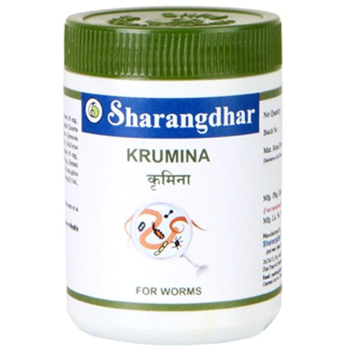 Krumina Tablet Krumina Tablet contains Vidanga (Emblica ribes), Vacha (Acorus calamus), Latakaranj (Caesalpinia bondusa), Trivrut (Mallotus phillippinesis), Palasha (Butua frondosa), Nadi Hingu (Gardenia gummifera), Chauhar (Artemisia maritima), Karpoor (camphor), and Pepperment Oil. The name Krumina itself suggest its functioning that is is a very good wormicidal. Improper digestion of food lead to worms infestation .The Contents of krumina activate the pachak agni (digestive power) and improves digestive function and hence destroy worms and basic cause for production of worms subsides. Krumina avoids the recurrence of worms as well as helps in easy excretion of stools thats why dead worms flush out easily. Precautions: Avoid having spicy oily food, milk products, sweets, alcohol, chocolate, biscuits, jiggery, kanjee while using the tablets. Use under medical supervision