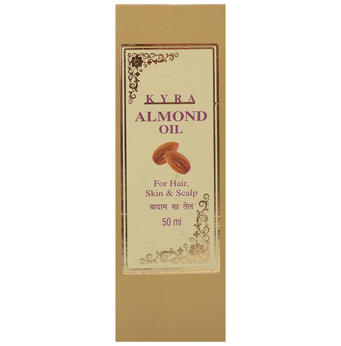 Kyra Almond Oil for Hair, Skin & Scalp Kyra Almond Oil for Hair, Skin & Scalp is a natural product with the goodness of almond oil, vitamin B-7 (Biotin) and vitamin E. Almonds are known for monounsaturated fatty acids, potassium and zinc which are good for skin and hair. It moisturises the skin and helps in curing acne, eczema and Psoriasis. It is also helpful in reducing the visibility of stretch marks. It can be used to improve skin complexion and tone.