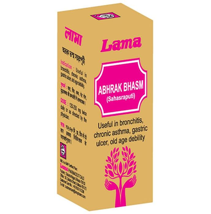 Lama Abhrak Bhasm (Sahasraputi) is specially formulated to help treat issues related to hyperacidity like stomachache, vomitting blood and gastric ulcer. It treats headaches and strengthens ligaments in the body. | Key Ingredients: Prepared from mica and juices | Key Benefits: It is useful in treating Bronchitis It helps in the treatment of Chronic Asthma It is used in the treatment of problems associated with hyperacidity such as stomachache and vomitting with blood It is also used to treat Headaches | Directions For Use: Consume 125 mg twice a day with milk or as directed by physician. | Safety Information: Store in a cool and dry place Store out of the reach of children Read the label carefully