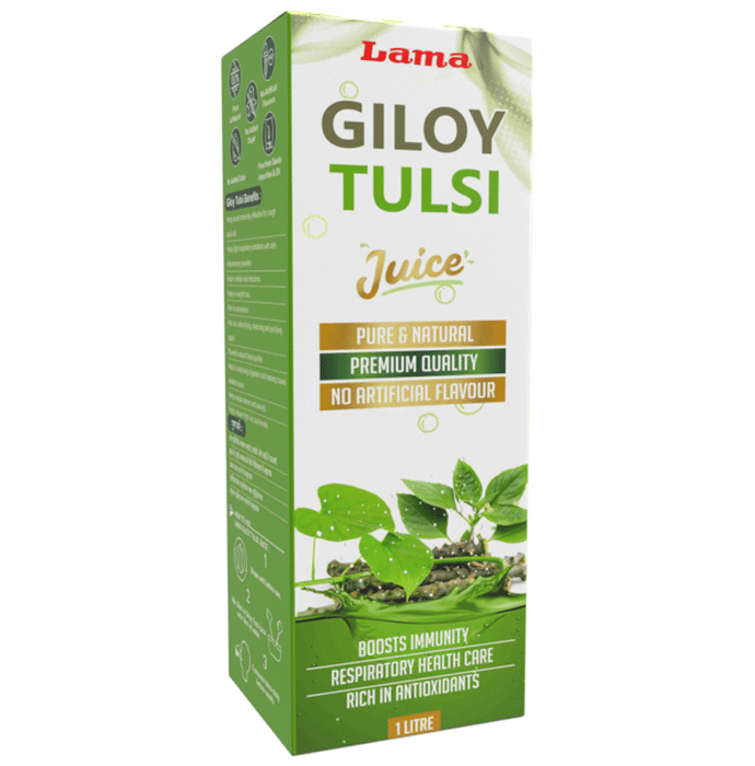 Lama Giloy Tulsi Juice boosts the immunity level for all ages, It increases blood and energizes the body, tulsi fights against various infections, It strengthens the respiratory system. | Key Ingredients: Giloy Tulsi | Key Benefits: Lama Giloy Tulsi Plus Juice contains the goodness of giloy and tulsi which are essential for the body The ingredients help to energize the body and fight infections Giloy aids in the elimination of toxins, the purification of the blood, and the control of blood sugar levels Giloy and tulsi both battle disease-causing bacteria, minimising fever and other illness symptoms | Directions For Use: 4 Spoonful twice daily, after lunch and dinner with water. | Safety Information: Read the label carefully before use Store in a cool dry place away from direct sunlight Keep out of reach of the children