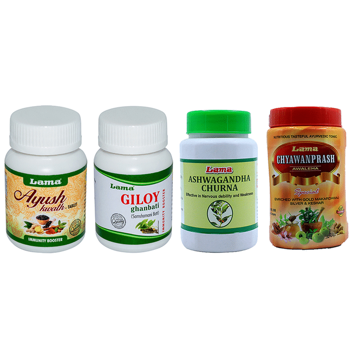 Lama Immunity Pack for Adults (Giloy Ghanbati 60 Tablet, Ayush Kwath 60 Tablet, Ashwagandha Churna 100gm & Chyawanprash Special 1kg)