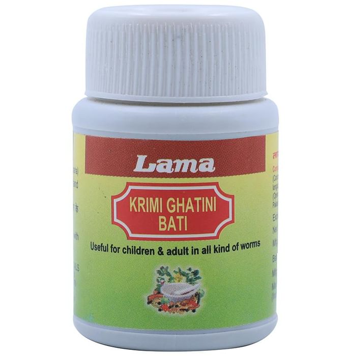Lama Krimi Ghatini Bati is an ayurvedic remedy which is useful in relieving worm infestation in both children and adults. It also helps in curing inflammatory conditions, nausea, colic pain and excessive sneezing. | Key Ingredient: Somraji Haridra Pipal Kamila Haritaki Nishoth | Key Benefits: Helpful in all types of intestinal worm infestation Useful in relieving inflammatory conditions Effective against colic pain and excessive sneezing | Directions For Use: Take 1-2 pills/ tablet twice a day with milk or as directed by physician | Safety Information: Read the label carefully before use Keep away from children Do not exceed the recommended dosage Store in a cool and dry place
