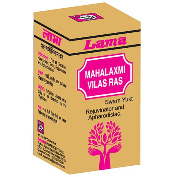 Lama Mahalaxmi Vilas Ras (Swarn Yukt) is a conciction of ingredients that when brought together, help treat breathing and respiratory issuessuch as Asthma, cough and cold. It enhances the functioning of the immune system and helps the body fight of any weakness. | Key Ingredients: Jaiphal Karpoor Swarna Bhasma Raupya bhasma Bang bhasma Abhrak bhasma Purified Mercury Tamra bhasma | Key Benefits: It is useful in the treatment of Asthma, Cough, and the Common Cold It is useful in improving the body's immune strength It is useful in fighting weakness and strengthening the body in the process | Directions For Use: 1 Tablet twice daily or as directed by physician | Safety Information: Store in a cool and dry place Keep out of the reach of children Read the manual carefully