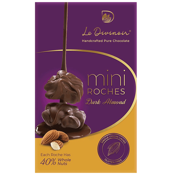 Le Divinoir Handcrafted Pure Mini Dark Almond Roches Created for self-indulgence and self-care, our bite-sized delight of Dark Almond Roches, made with single-origin cacao and whole roasted Californian almonds, is the perfect choice for chocoholics who enjoy the little things in life. The rich and crunchy taste of the handcrafted pure Roches is the absolute choice to treat yourself and coddle your taste buds. You can celebrate the little moments of happiness and contentment with each scrumptious bite. Inside the compact box are 8 little joys of vegan and gluten-free dark almond Roches that embody a divine and whimsical experience. Lose yourself in the divine and crunchy taste of our handcrafted pure mini Roches and be your own cheerleader. | Key Ingredients: Almond Sugar Cocoa Solids Cocoa Butter Emulsifiers (INS322(i), INS476) Contains nature-identical vanilla flavouring | Key Benefits: Each Roche has 40% of whole roasted almonds and 60% of pure chocolate Made with single-origin cacao and whole roasted Californian almonds The crunchy texture and rich flavour is an absolute delight to your taste buds Made without the use of any vegetable fat | Directions For Use: Ready to eat delectable treats. | Safety Information: Store in a cool and dry place away from direct sunlight Keep out of reach of children Read the label for allergen information