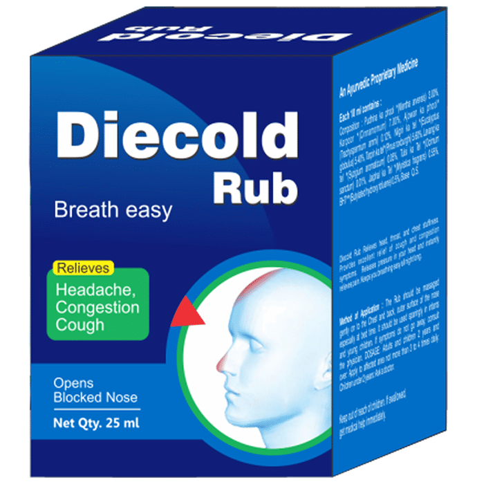 Leeford Diecold Rub helps in relieving head throat and chest stiffness. It helps in giving excellent relief from cough and congestion symptoms. It helps in releasing pressure in your head and instantly relieves pain. | Key Ingredients: Pudina Kapoor Nilgiri tel Tulsi Lavang | Key Benefits: Diecold Rub has multiple action, relieves symptoms of common cold, body or muscle pain and headache It soothes irritated nasal and throat passages It relaxes the throat muscles, reducing cough reflex | Directions For Use: The rub should be massaged gently on the chest and back | Safety Instructions: Keep out of reach of children Keep in a cool and dry place