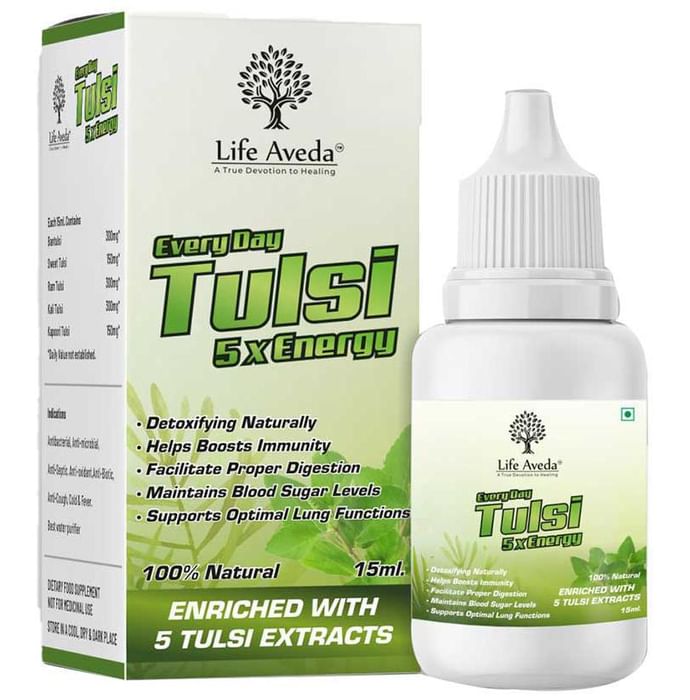 Life Aveda EveryDay Tulsi 5X Energy Drop Life Aveda EveryDay Tulsi helps in boosting immunity. It is antioxidant.It is antibacterial liquid and it also maintains sugar level in the body.It comes in the liquid form and it is easy to store. It facilitates proper digestion.