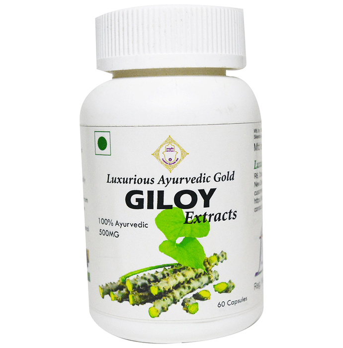 Luxurious Ayurvedic Gold Giloy Extracts 500mg Capsule Luxurious Ayurvedic Gold Giloy Extracts 500mg Capsule is helpful in fighting respiratory problems and contains anti-ageing properties that help reduce dark spots, pimples, fine lines and wrinkles.