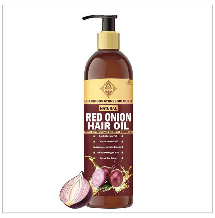 Luxurious Ayurvedic Gold Natural Hair Red Onion Oil Luxurious Ayurvedic Gold Natural Hair Oil Red Onion is a proven remedy to boost hair regrowth and prevent hair fall. This is a widely used Ayurvedic solution to ensure healthy and thick hair. All one needs is a continuous dedication to apply this hair oil regularly.