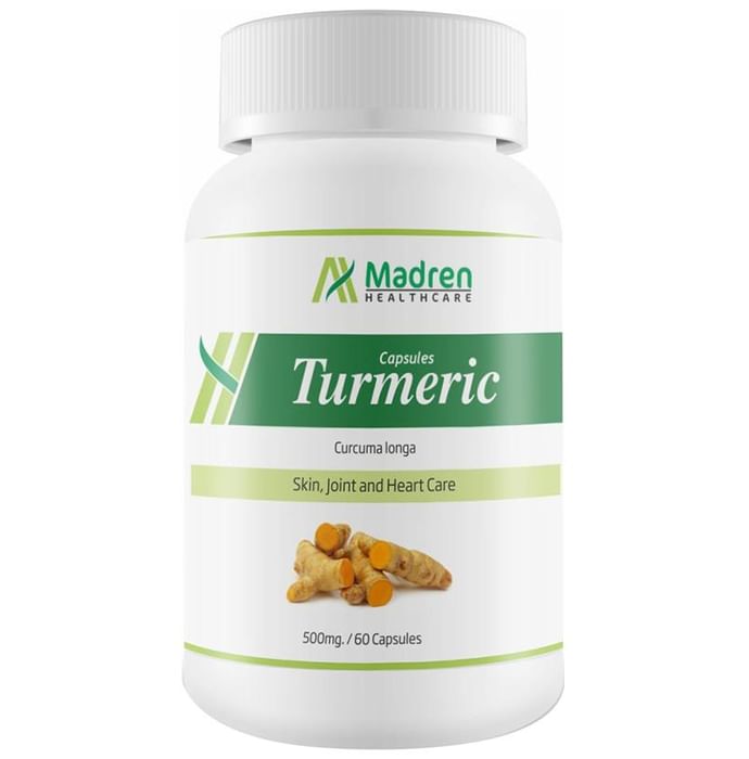 Madren Healthcare Turmeric 500mg Capsule Madren Healthcare Turmeric 500mg Capsule helps in improving overall wellness, both physical and mental. It helps in immunity enhancement and restores a better quality of life. Curcumin in Turmeric is a natural antioxidant that has anti-inflammatory benefits. Ancient study says that Turmeric shows a beneficial effect in treating heart disease, Osteoarthritis, Diabetes, Alzheimer's Disease, Depression, Rheumatoid Arthritis, and skin health. It also contains anti-aging benefits.