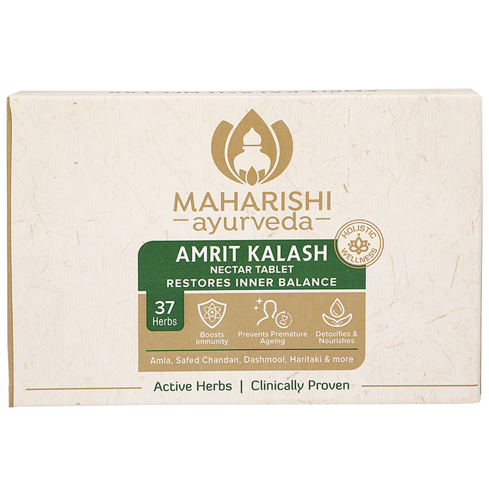 Maharishi Ayurveda Amrit Kalash 4 Tablet Sugar Free Maharishi Amrit Kalash 4 Sugar-Free Key benefits of Maharishi Amrit Kalash 4 Sugar-Free: Increases longevity, memory, and intelligence. Enhances immunity, elevates energy levels. Decreases the effects of aging and enhances overall well-being. Possess 1000 times more antioxidant power than Vitamin C or E. Improves three types of mental function: acquisition, retention, and recall. Improves the function of nervous system, respiration, circulation, and elimination. Boosts productivity and improves creativity and also reduces fatigue and combats stress. Improves the junction points or gaps in the step-by-step transformation of the 7 tissues—plasma, blood, muscle, fat, bone, bone marrow and reproductive fluid. Direction for use: Take 1 tablet preferably with milk or followed by 1 tablet of Maharishi Amrit Kalash-5 Ambrosia, with half hour interval in morning. The Same dose to be repeated in the evening. Safety information: Keep out of the reach and sight of the children. Use under medical supervision.