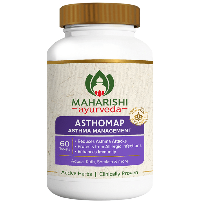 Maharishi Ayurveda Asthomap Tablet ASTHOMAP TABLETS HIGHLY EFFECTIVE FOR: Asthma, Chronic Bronchitis, Chronic cough, Cough. PRODUCT DESCRIPTION: Maharishi Ayurveda Asthomap is judicious combination of herbs which counteracts respiratory allergies, allays and arrests broncho-spasms, exerts prompt mucolytic action, tones up the respiratory mucosal lining and dilates bronchioles. Asthomap contains natural immuno-modulators which enhance the body's immunity to respiratory diseases. Asthomap corrects imbalance of Vata and Kapha and improves the quality of Pitta to restore order in respiration. Asthomap contain no steroids hence is safe for a long term use. Prolonged use of Asthomap reduces hypersensitivity to allergens and reduces intensity and frequency of asthmatic attacks . Asthomap corrects digestion also. INDICATIONS: Bronchial Asthma. Chronic Bronchitis. Bronchial and Respiratory allergies, Pulmonary Eosinophilia, Emphysema, As an adjuvant in the treatment of chronic cough. CONTRA-INDICATION: Asthomap is not recommended in patients of congestive heart failure. INGREDIENTS: Each 500mg tablet of Asthomap contains: Talispatra Abies webbiana 3.65mg KaliMirch Piper nigrum 3.65mg Shunthi Zingiber officinale 11.00mg Pippali Piper lingum 14.55mg Vanshlochan Bambusa arundinacea 29.20mg Ela Elettaria cardamomum 7.30mg Twak Cinnamomum Zeylaincum 3.65mg Soma Lata Sarcostemma brevisitigma 76.65mg Yashtimadhu Glycyrrhiza glabra 76.65mg Vasa Adhatoda vasica 76.65mg Kushta Saussurea lappa 76.65mg Mishri Crystal sugar 116.80mg DOSAGE: 1 to 2 tablets thrice a day or as advised by the physician. PACKING: 100 tablets in a bottle. Use under medical supervision.