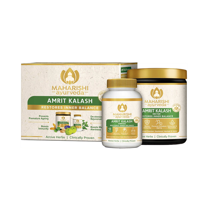 Maharishi Amrit Kalash Dual Pack is a combo-pack of 600gm Paste and 60 tablets which contain many beneficial Herbs This ancient Ayurvedic herbal supplement is known to provide balance and strength to body’s immune system by protecting the body against free radical damage. It is the most powerful of all known Ayurvedic supplements, which gives one the energy no other supplement can give. The latest research shows that one gram of Amrit Kalash is more effective against free radicals than 1,000 grams of vitamin C and E. It takes 250 careful steps to prepare this special product and 22 pounds of raw ingredients are required to produce a single jar of the Fruit concentrate. Maharishi Amrit Kalash Benefits : Increases longevity, memory and intelligence. Enhances immunity, elevates energy levels. Decreases the effects of aging and enhances overall well-being. It has 1000 times more anti-oxidant power than Vitamin C or E. Improves three types of mental function: acquisition, retention, and recall. Improves the function of nervous system, respiration, circulation and elimination. Boosts productivity and improves creativity and also reduces fatigue and combats stress. Improves the junction points or gaps in the step-by-step transformation of the 7 tissues—plasma, blood, muscle, fat, bone, bone marrow and reproductive fluid. Indications: Maharishi Amrit Kalash improves the following: The three types of mental function: acquisition, retention, and recall. Metabolic transformations, digestion, the emotions and their effect on heart function. The mind, nervous system, respiration, circulation and elimination. Moisture balance, physical structure and strength. The junction points or gaps in the step-by-step transformation of the 7 tissues—plasma, blood, muscle, fat, bone, bone marrow and reproductive fluid. The micro-circulatory channels that transport nutrients and energy and can be blocked by improperly digested impurities. The finest product of digestion and the master coordinator between consciousness, matter and immunity. The vitality and strength of the mind and body. Ingredients: Maharishi Amrit Kalash Nectar (MAK4) Indian Goosberry (Amla),Haritaki,Cobra's Saffron,White sandalwood,Cardamom,Indian Pennywort,Chois Aloeweed,Turmeric,Long Pepper(Catkins),Liquorice,Nagarmotha,Nut grass,Large Caltrops,Cashmere Bark,Tik Trefoil,Country Mallow,Prisniparni,Mashaparni,Trumpet Flower,Trumpet Tree,Indian nightshade,Wild Sugar Cane,Indian Kudzu,Wild Gram,Sugar Cane root,Giant Potato,Jivanti,Small Caltrops,Spreading Hogweed,Indian asparagus,Sugar,Ghee Maharishi Amrit Kalash Ambrosia (MAK5) tablets contains: Ingredients 500mg tablets Winter Cherry,Liquorice,Giant Potato,White Musale,Indian Gooseberry,Heart-leaved Moonseed,Indian Asparagus,Indian Wild-Pepper,Aloeweed,Elephant Creeper,Black Musale,Caper plant,Indian Gum Arabic Tree Dosage: 10 gms of MAK4 (Paste) Nectar preferably with milk followed half an hour later with 1 tablet MAK5 Ambrosia, in the morning. Same dose to be repeated in the evening.