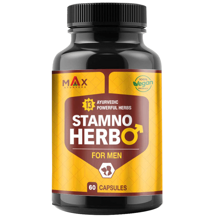 Max Ayurveda Stamno Herbo for Men Capsule Max Ayurveda Stamno Herbo for Men Capsule is scientifically formulated from 13 herbs extracts Safed Musli, Ashwagandha, kaunch Beej, Irani Akarkara, Shuddha, kokilaksha, Gokhru, Brahmi Neer, Amla, Jaiphal, Pippali, Lavanga, Lausan and Piper bettle herbs extracts after extensive trails & approval from Ayush Department. Stamno Herbo is designed for improving stamina and energy levels.