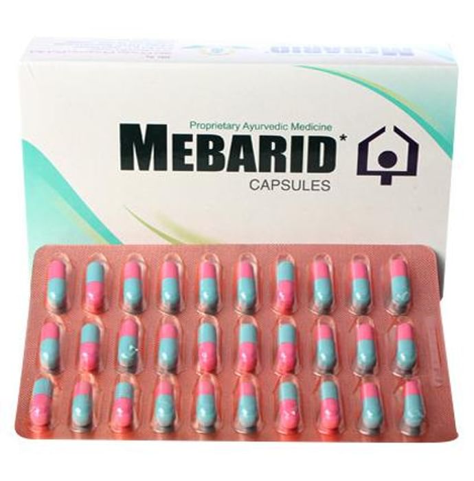 Mebarid Capsule Mebarid Capsule is an ayurvedic formulation made with herbs which possess dual action of dysentery and diarrhea. It contains herbs such as Daimsal, Kuda, Jaiphal, Mochras Panchamrit Parpati . It reduces frequency of passing loose stool (loose motions) and prevents dehydration. It is safe to give to kids along with ORS to prevent dehydration. It directly destroys the pathogenic intestinal microorganisms and increases intestinal immune response by building up resistance against harmful organisms. Mebarid capsule also normalizes gastrointestinal functions. Daimsal and Kuda which have antimicrobial properties, Jaiphal acts as relaxant, Mochras have Soothing, Binding and normalizing properties and Panchamrit Parpati acts as an antiseptic. Mebarid Capsule is indicated in cases of diarrhoea, dysentery and intestinal infections. Directions of use: Adults : 1 Capsule 3 times daily. Children : 1 Capsule twice or thrice daily. Use under medical supervision.