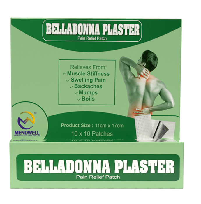 Mendwell Belladonna Plaster Pain Relief Patch 11cm x 17cm aids in the application of heat therapy to strained muscles and tissues. It aids in the treatment of rheumatic disorders as well as offers temporary relief from strained muscles. It is beneficial in the treatment of muscle stiffness, mumps boils, and backache. | Uses: Mendwell Belladonna Plaster Pain Relief Patch provides relief to strained and sprained tissues and muscles. | Product Specification and Features: Mendwell Belladonna Plaster Pain Relief Patch helps in providing heat therapy to the strained muscles and tissues It is helpful in the treatment of Rheumatic conditions and also aids in providing temporary relief to strained muscles It is helpful in the treatment of muscle stiffness, mumps boils and also aids in providing relief in backache | Directions For Use: Use as directed on the label or as advised by the physician. | Safety Information: Read the label carefully before use Do not exceed the recommended dosage Store in a cool and dry place away from direct sunlight Keep out of reach of children