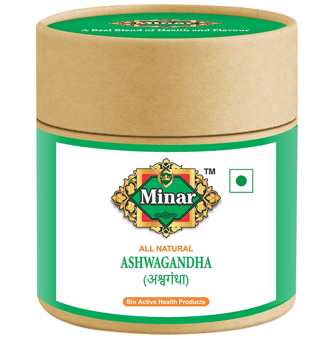 Minar Ashwagandha Powder is packed with herbal goodness. The ashwagandha plant is a little bush with yellow blossoms local to India and North Africa. Concentrates or powder from the plant's root or leaves are utilised to treat various conditions. It is one of the most significant spices in Ayurveda, a type of elective medication dependent on Indian standards of characteristic mending. Practitioners use this herb as a general tonic to boost energy and reduce stress and anxiety. It is known to contain immunomodulatory and inflammation-reducing properties. | Key Ingredients: Natural Ashwagandha Leaves Powder | Key Benefits: Ashwagandha may help brain function and increase concentration Helps lower blood sugar and cortisol levels It may help reduce stress and anxiety It might improve muscle mass and strength | Directions For Use: Mix 1/4 to 1/2 tablespoon of ashwagandha root powder in a glass of warm milk or along with ghee, sugar and honey Drink this at bedtime | Safety Measures: Read the label carefully before use Do not exceed the recommended dosage Keep out of reach of children