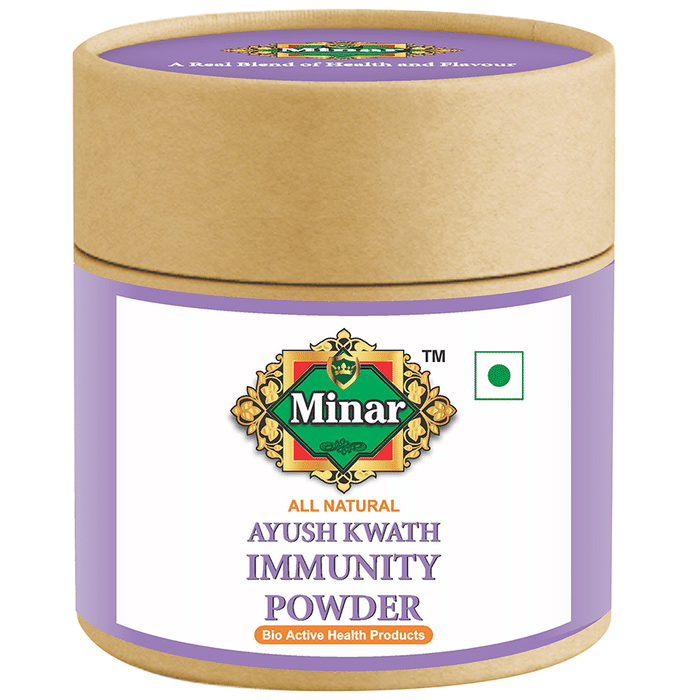 Minar Ayush Kwath Immunity Powder is a herbal formulation that boosts immunity against various infections. It contains anti-viral, antioxidative and anti-inflammatory properties, that may be effective in regulating immunity for the prevention and reduction of viral diseases and other related complications. | Key Ingredients: Salem Turmeric Cumin Seeds Coriander Seeds Black Pepper Cinnamon Powder | Key Benefits: Promotes younger skin and healthier hair due to its multivitamin content, including biotin, iron, zinc, vitamin A, B, C and D May improve immunity to fight against various pathogens and help prevent infections Can relieve coughing, sore throat, common cold, and other respiratory ailments | Directions For Use: Use as advised by your healthcare provider or nutritionist. | Safety Information: Store this product in a cool and dry place away from direct sunlight Do not exceed the recommended dosage Keep the product in an air-tight container and do not use a wet spoon to handle it