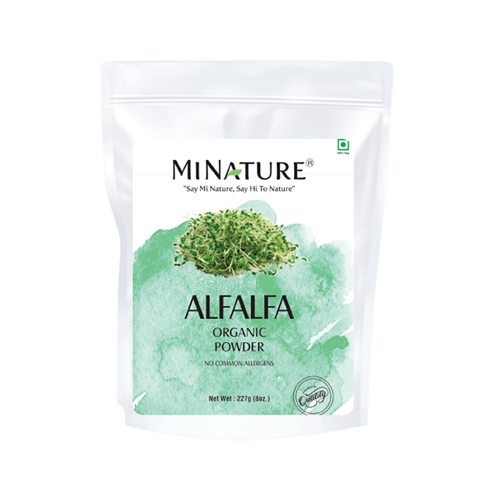 Minature Alfalfa Organic Powder It is a dietary supplement formulated with alfalfa powder that promotes overall health and well-being. Alfalfa is a fibre-rich food with plant compounds called saponins that lower cholesterol absorption in the intestines. It may help control diabetes and prediabetes and regulate blood sugar levels. | Key Ingredients: Alfalfa powder | Key Benefits: Alfalfa contains vitamin K and other essential vitamins and minerals that promote overall health It is a fibre-rich food that helps promote metabolism and boosts digestion It has bioactive plant compounds called saponins that lower cholesterol absorption in the intestines It may help control diabetes and prediabetes and regulate blood sugar levels Alfalfa has anti-inflammatory properties that can relieve joint pain due to inflammation in arthritis and other associated joint problems It has antioxidant properties that help fight against free radicals and improve immunity | Directions For Use: Use as directed on the label or as directed by your physician | Safety Information: Read the product label carefully before use Store in a cool and dry place away from direct sunlight Keep out of reach of children Consult a doctor before taking any supplement Do not exceed the recommended dosage Pregnant or nursing mothers, children, and people with medical conditions must consult a physician before taking this supplement Do not use if the product appears to be tampered with or the seal is broken