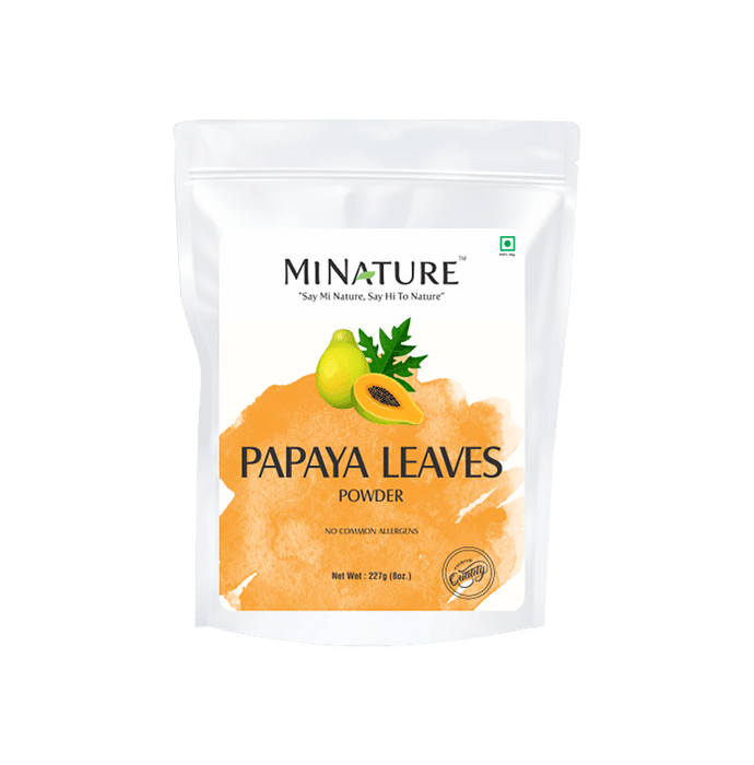 Minature Papaya Leaves Powder is one of the typical treatments for dengue symptoms. It improves digestion, supports hair growth, and the health of the skin in addition to assisting in blood sugar regulation. Powder made from papaya leaves has anti-inflammatory effects. As a result, it is utilised to enhance the health of the skin and hair. It might also possess anti-cancer qualities. | Key Ingredients: Papaya leaf | Key Benefits: It is used to manage respiratory problems common cold, flu, headaches, urinary tract infections and fluids retention It helps in delaying the signs of premature ageing and keeps you looking youthful It has antioxidant and anti-inflammatory properties. It improves digestion and detoxifies the blood It adds bounce and shine to the hair while making it soft and smooth It improves the platelet count and boosts the immune system, besides keeping other contagious infections at bay | Directions For Use: Use as directed on the label or as advised by your healthcare provider. | Safety Information: Read the label carefully before use Store in a cool and dry place away from direct sunlight Keep out of reach of children