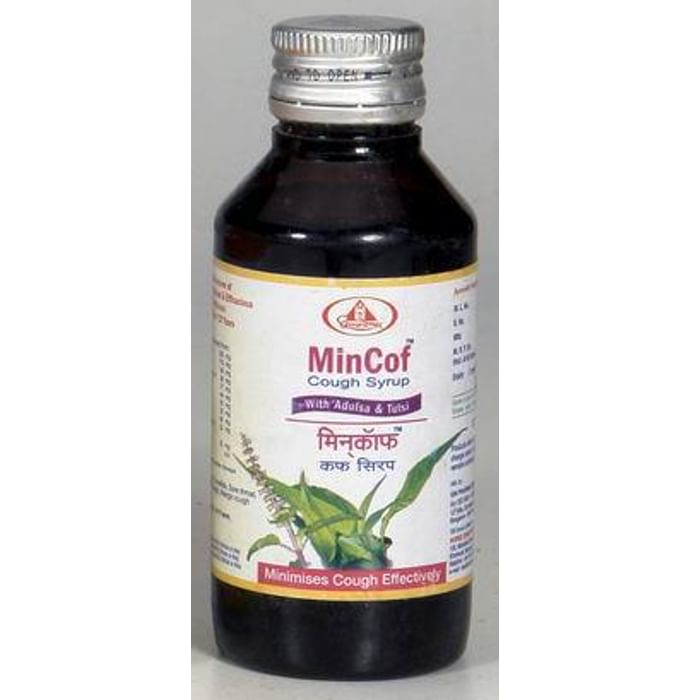 Mincof Syrup Mincof Syrup is a proprietary Ayurvedic medicine used in treatment of cough, soar throat etc. It contains Vasa (Malabar nut tree (root / whole plant) Adhatoda vasica) ,Banapsha (Viola odorata), Yashti (Licorice Glycyrrhiza glabra), Kantakari (Yellow berried nightshade (whole plant) Solanum xanthcarpum), Bibhitak (Belliric Myrobalan fruit rind-Terminalia bellirica), Tulsi (Holy Basil-Ocimum sanctum), Haridra (Turmeric rhizome-Curcuma longa), Pippali (Long pepper fruit-Piper longum), Shunthi (Ginger-Zingiber officinalis), Bharangi Root (Clerodendron serratum), and Narsar (Ammonium chloride) Mincof Syrup is indicated in treatment of Productive Cough, Dry Cough, Whooping Cough, Tonsillitis, Sore Throat, Smokers Cough, Allergic Cough and asthma. Effect on Tridosha Balances Vata and Kapha. Direction for use: Infants: 2.5 ml thrice a day Children: 5 ml thrice a day Adults: 10 ml thrice a day, or as directed by your physician. Use under medical supervision.