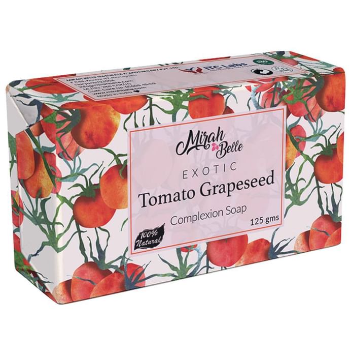 Mirah Belle Exotic Tomato Grapeseed Complexion Soap helps to get rid of dull, rough skin and promotes cellular renewal. Tomatoes contain salicylic acid – a common ingredient in acne products. Grapeseed Oil, extracted from the seeds of grapes, is a lightweight oil that easily absorbs into the skin without leaving a greasy feeling. | Key Ingredients: Fresh Tomato Pulp Grapeseed Oil Organic Soap Base | Key Benefits: Tomato also helps to shrink large pores and brightens up your complexion As a natural astringent, tomato keeps the skin firm and helps diminish fine lines Rich in linoleic acid, (Omega 6), a moisturizing fatty acid quite important for the skin and cell membranes Treats sensitive, dry flaky skin, pigmentation with dark spots Our soaps are free of Chemicals, Paraben, Sulphate, SLS and Silicon | Directions For Use Wet the bar and massage gently on the skin to create lather and wash. Rinse well and pat dry. | Safety Information: Read the label carefully before use Store in a cool dry place away from direct sunlight Keep out of reach of the children For External use only When using any new product, we recommend a patch test for allergies or sensitivities