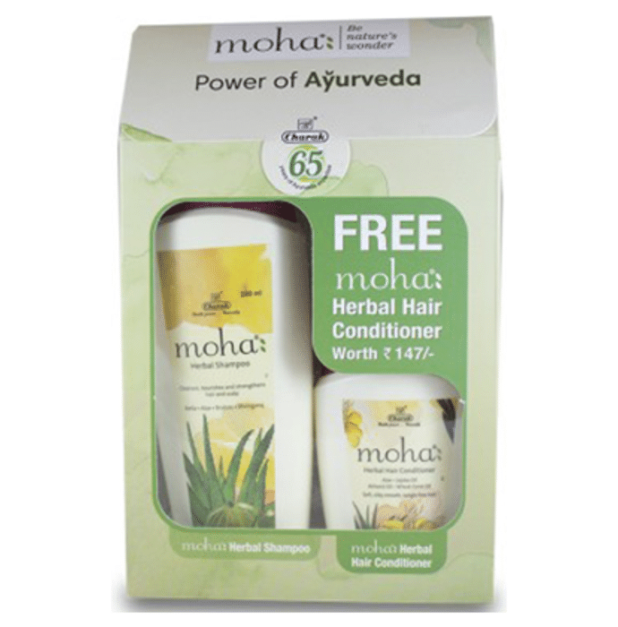 Moha Herbal Shampoo 200ml with Free Herbal Hair Conditioner 100ml is a herbal shampoo formulated for strengthening and cleansing hair. It washes away the impurities and pollutants hair is subjected to every day. | Key Ingredients: Amla Aloe vera Brahmi Bhringaraj | Key Benefits: It is an all-natural hair cleanser that washes away impurities and pollutants from one's hair thus keeping both, hair and scalp squeaky clean and fresh It helps prevent hair loss and stimulates stronger and faster hair growth The shampoo provides hair and scalp with needed nourishment | Directions For Use: Use as directed on the label. | Safety Information: Read the label carefully before use Store in a cool and dry place away from direct sunlight Keep out of reach of the children