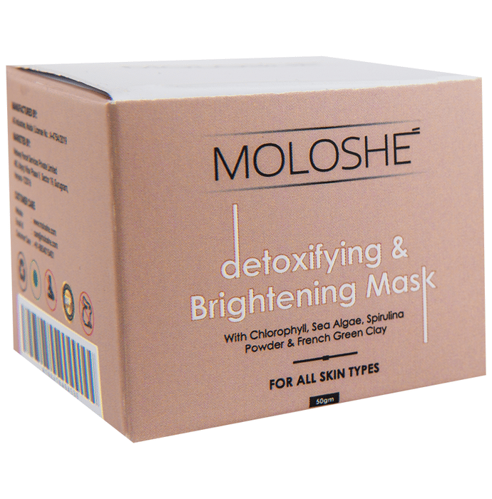 Moloshe Detoxifying & Brightening Mask Moloshe Detoxifying and Brightening Mask contains natural ingredients like chlorophyll, sea algae, and spirulina powder that can help achieve a healthy glow. This face mask can help fade blemishes and cleanse the blood with its antibacterial properties. French green clay is a powerful antioxidant that can protect against free radicals and environmental stresses on the skin.