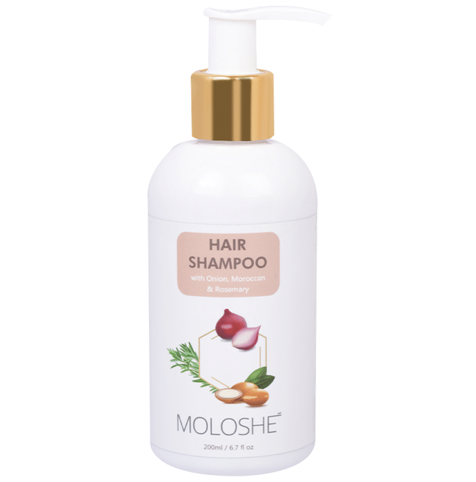 Moloshe Hair Shampoo is an anti-hair fall and nourishing shampoo that can help manage dry, coarse, curly or brittle hair, making them soft, voluminous and shiny. This shampoo helps prevent breakage and protects from dust and pollution without damaging the scalp and hair. | Key Ingredients: Onion extract Keratin Aloe vera extract Moroccan oil Camellia seed oil Green tea extract Gudhal extract Rosemary oil Reetha extract Shikakai extract | Key Benefits: Onion extract can help stimulate the scalp, promoting blood circulation and hair regrowth Keratin can help prevent damage and dryness, leaving hair soft and smooth It can help protect your hair from everyday pollution This shampoo gently cleanses hair and can help prevent damage caused due to washing Rosemary can help de-stressing and clears the scalp build-ups This product contains no sulfates, paraben, silicones or toxins | Directions For Use: Damp your hair and apply the shampoo Massage the shampoo on the scalp using fingertips to form lather Wash it off with a cold water rinse Let it air dry | Safety Information: Read the label carefully before use Keep out of reach of children Store in a cool, dry place away from direct sunlight