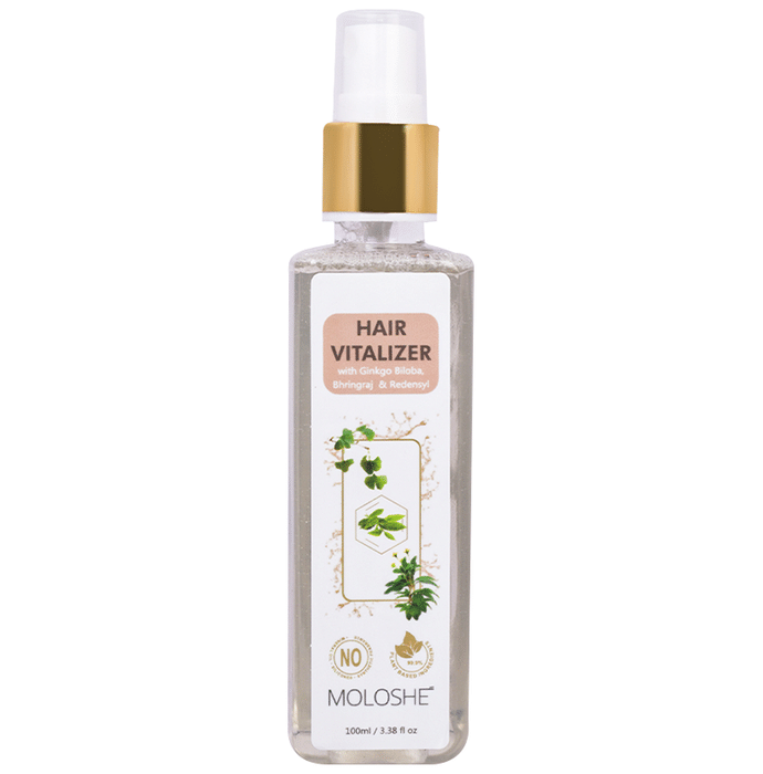 Moloshe Hair Vitalizer is a formulation that can help vitalize hair roots, promote hair growth, stimulate hair follicles, and control excessive hair loss. This vitalizer promotes scalp health and works on hair stem cells to improve the lifespan of the hair. This vitalizer is complete hair care for dull, dry, thin, lifeless or dandruff prone hair. | Key Ingredients: Rice extract Herbal bhringraj Brahmi Ginkgo biloba Amla Arginine Gudhal Chamomile calendula Vitamin E Biotin Green tea extract Sandalwood extract Aloe vera extract Lemon oil Keratin Biotin Redensyl Tea tree | Key Benefits: It helps promote hair growth and contains good hair growth ingredients like redensyl and biotin It has nourishing and active ingredients that can help keep hair healthy, hydrated and protected Promotes scalp health and works on hair stem cells to improve the lifespan of the hair Herbs such as ginkgo biloba, bhangra, and brahmi can help minimize hair fall and promote new hair growth, also strengthening roots With gudhal flower, it can help to form a shield which prevents breakage This product contains no sulfates, parabens, silicones or toxins | Directions For Use: Spray all over your hair and scalp on shampooed hair Massage lightly with fingertips No need to wash it; it comes with a non-sticky formula | Safety Information: Read the label carefully before use Keep out of reach of children Store in a cool, dry, and dark place at a temperature not exceeding 25C