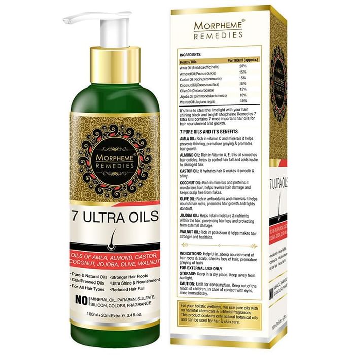 Morpheme Remedies 7 Ultra Hair Oils Morpheme 7 ultra hair oil contains 7 most important hair oils for hair nourishment and growth which includes Amla Oil (Emblica officinalis), Almond Oil (Prunus dulcis), Castor Oil (Ricinus communis), Coconut Oil (Cocos nucifera), Olive Oil (Olea europaea), Jojoba Oil (Simmondsia chimesis), Walnut Oil (Juglans regia). This oil helps in preventing thinning, premature graying of hair and promotes hair growth. Key benefits Morpheme 7 Ultra Hair oil: Prevents thinning, premature graying of hair. Promotes hair growth. This oil smoothes hair cuticles. Helps to control hair fall and adds luster to damaged hair. Rich in vitamin C, vitamin A, vitamin E. Rich in minerals and proteins. Helps retain moisture & nutrients within the hair. Helps makes hair stronger and healthier. Protects and repairs hair fibers. No chemicals and preservatives. Direction for use: Apply oil on tip of your fingers and rub it gently on the base of your hair enabling it to penetrate into the roots of your hair. Leave it overnight or for few hours. Wash with regular shampoo or prefer a natural shampoo. Recommendation: Morpheme 7 ultra hair oil should be used on daily basis for best and noticeable results. Use under medical supervision.