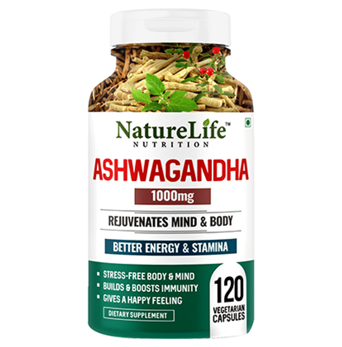 Nature Life Nutrition Ashwagandha 1000mcg Vegetarian Capsule is made with the goodness of Ashwagandha Extract. These capsules are your personal potion of strength and vitality. Ashwagandha, also called Indian Ginseng, is a powerful medicinal herb that relieves stress, enhances stamina, regulates muscle mass and strength, and promotes superior cognitive functioning. Its neuroprotective and anti-inflammatory properties safeguard the body against various health conditions. With the increasing pressure and competition, you are bound to get stressed and feel low, but now no more! Get your hands on these capsules and transform your stress into vitality for improved performance! | Key Ingredients: Ashwagandha powder | Key Benefits: Helps normalize cortisol levels Reduces stress and anxiety Has potent anti-inflammatory and immunity-boosting properties Gives a happy feeling | Directions For Use: As directed by the dietician and nutritionist. | Safety Instructions: Read the label carefully before use Store in a cool dry place away from direct sunlight Keep out of reach of the children Use under medical supervision