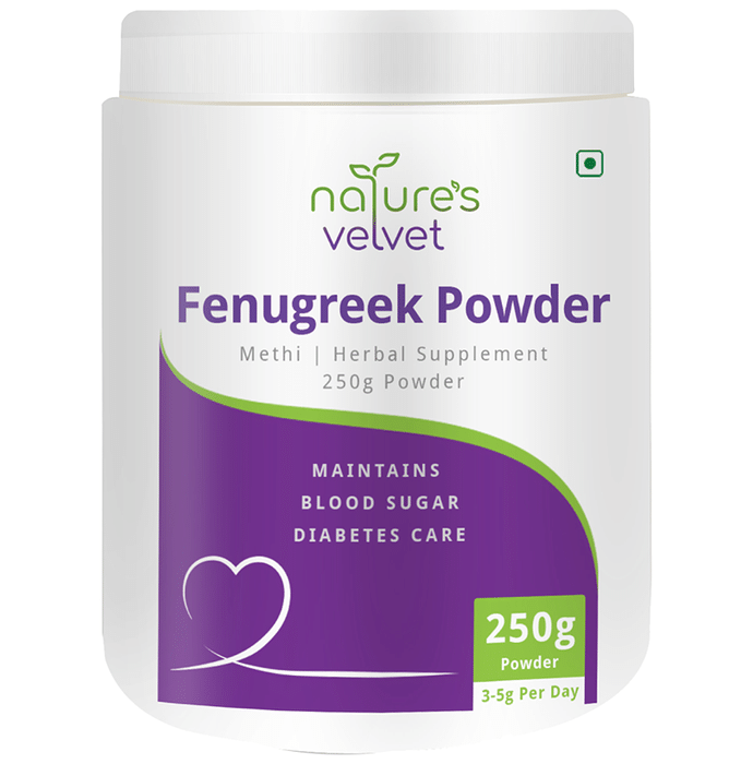 Nature's Velvet Fenugreek Powder also known as methi is used as a herb (dried or fresh leaves/seeds), spice (seeds), and vegetable (fresh leaves, sprouts, and microgreens). Traditionally, Methi has been used for various disorders such as diabetes, high cholesterol etc. It is known to correct and maintain lipid metabolism, thereby checking the weight. | | Key Ingredients: Fenugreek seeds | Key Benefits: Helps to correct and maintain lipid metabolism Helps maintain normal blood sugar Provides support to muscles and joints Helps to assist in treating the digestive problems | Directions For Use: Take a half teaspoon with warm water on an empty stomach twice a day or as directed by the physician. | Safety Information: Read the label carefully before use Keep out of reach of the children Store in a cool dry place If you are pregnant, nursing or under other medications, consult your doctor before use Discontinue and consult your doctor, if any adverse reactions occur