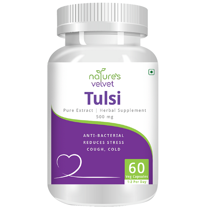 Nature's Velvet Tulsi Pure Extract 500mg Capsule Nature's Velvet Tulsi Pure Extract 500mg Capsule is rich in antioxidant properties which prevent the damage caused by free radicals. Tulsi is known to provide relief in the condition of cold, sore throat, dry and wet cough. Moreover, it helps in balancing hormones and lowering the stress level.