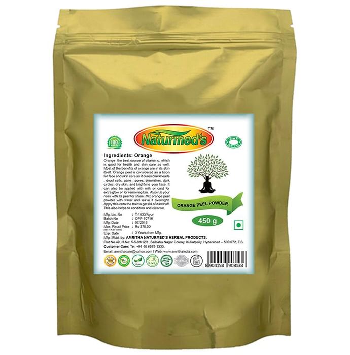 Naturmed's Orange Peel Powder Naturmed's Orange Peel Powder is an all-natural formulation used for the treatment of various skin disorders such as, uneven skin tone, blackheads, dead skin cells, acne, pores, blemishes, dark spots. It helps to brighten the skin complexion and when mixed with milk or curd it forms a mask and helps to make skin radiant and healthy.