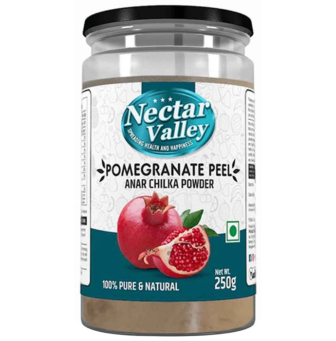 Nectar Valley Pomegranate Peel has multiple benefits such as boosting the regeneration of skin cells and delaying the appearance of signs of ageing. It can also help treat bacterial and fungal skin infections. | Key Ingredients: Pomegranate peel | Key Benefits: It boosts the regeneration of skin cells It acts as a natural moisturiser for overly dry skin, thanks to its ellagic acid content It can help prevent enzymes that break down collagen. This, in turn, can help delay early signs of ageing naturally and at the same time, boost skin cell growth It can also help treat bacterial and fungal skin infections It is packed with antioxidant and antimicrobial properties Pomegranate peel has astringent properties that help reduce the size of pores and at the same time, tightens the skin, preventing it from sagging | Directions For Use: Use as directed by the physician. | Safety Information: Read the label carefully Store in a cool and dry place Keep out of the reach of children