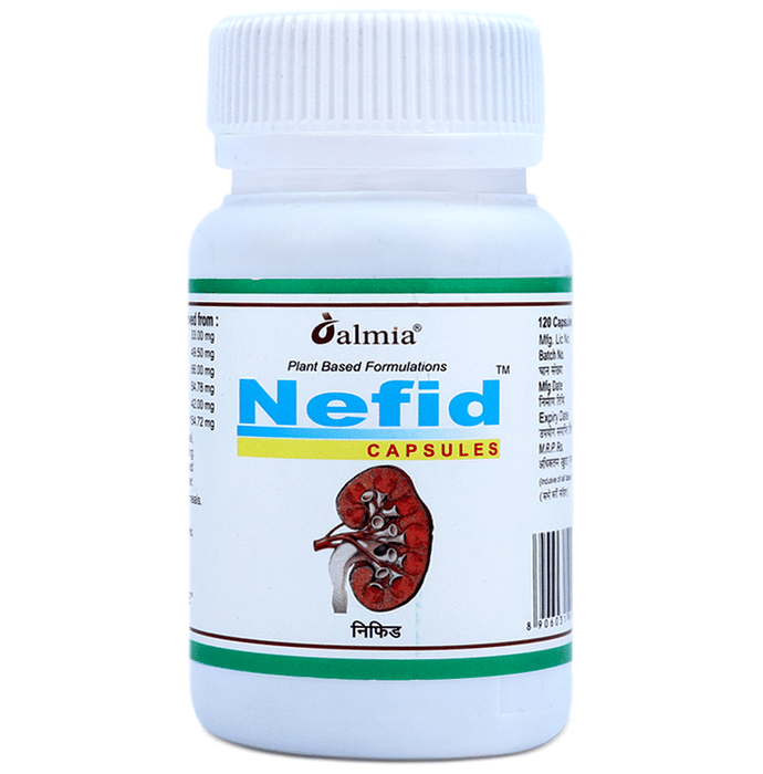 Nefid Capsule It is a dietary supplement formulated with dugdhica, palash and gokshur that promotes your kidney health. It helps to detoxify your body by removing harmful toxins from the kidney. It can help in the removal and dissolution of kidney stones. It also helps prevent the recurrence of stones formed in the renal and urinary bladder. | Key Ingredients: Pashan-bhade Palash Dugdhica Gokshur | Key Benefits: It is a dietary supplement that promotes your kidney health It helps to detoxify your body by removing harmful toxins from the kidney It can help in the removal and dissolution of kidney stones It also helps prevent the recurrence of stones formed in the renal and urinary bladder The anti-lithiasis property of gokshura can prevent the formation of kidney stones and reduce the size of the formed ones Palash helps in lowering the risk of kidney stones by reducing the growth and number of calcium oxalate stone deposits in the kidney | Directions For Use: Take two capsules twice a day after meals or as directed by your physician | Safety Information: Read the product label carefully before use Store in a cool and dry place away from direct sunlight Keep out of reach of children Consult a doctor before taking any supplement Do not exceed the recommended dosage Pregnant or nursing mothers, children, and people with medical conditions must consult a physician before taking this supplement Do not use if the product appears to be tampered with or the seal is broken