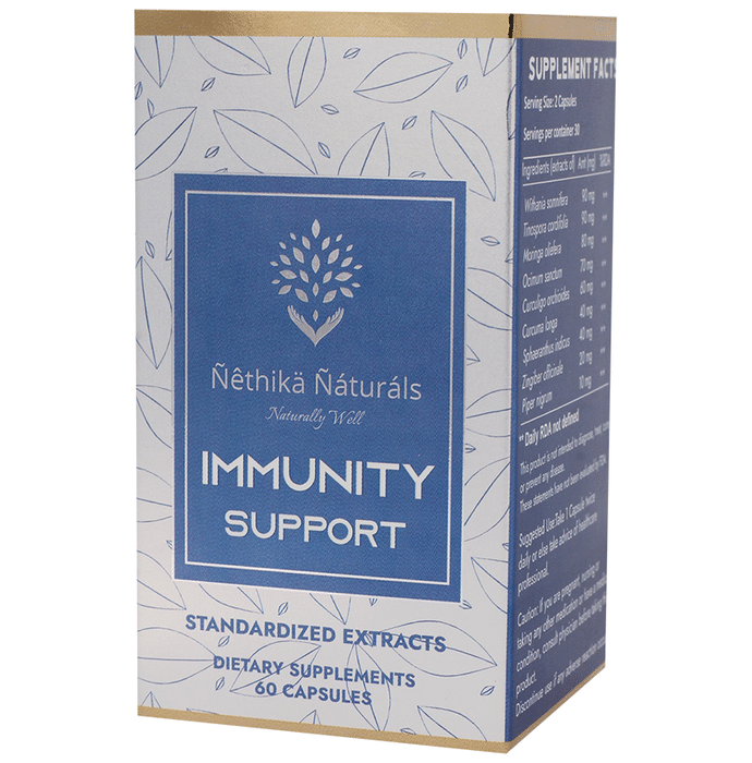 Nethika Naturals Immunity Support Capsule Improves the immune system's performance and supports the body's natural stress reaction. It has antiviral and antibacterial properties that fight against allergy symptoms such as sneezing, itching, and nasal discharge. It prevents infections of the respiratory tract. It contains Giloy, which is high in antioxidants that combat free radicals and aid to alleviate cold and cough symptoms. It also aids in the prevention of respiratory infections, detoxification, and the enhancement of delayed-type hypersensitivity. | Key Ingredients: Ashwagandha extracts Giloy extracts Tulsi extracts Turmeric extracts Ginger extracts Kali musli Black pepper | Key Benefits: Nethika Naturals Immunity Support Capsule is beneficial for enhancing the immune system of the body It helps to increase the body’s natural response against physical and metabolic stress and aids in calming the brain It contains Giloy which is rich in antioxidants that fight against free radicals and help to reduce the symptoms of cold and cough It also helps to prevent respiratory tract infections, detoxifies the body and enhances delayed-type hypersensitivity | Directions For Use: Use as directed on the label or as advised by the physician. | Safety Information: Read the label carefully before use Do not exceed the recommended dosage Store in a cool and dry place away from direct sunlight Keep out of reach of children