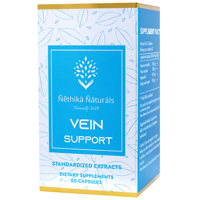 Nethika Naturals Vein Support Dietary Supplements Capsule helps to strengthen capillary walls and improves blood circulation in the lower body. It is beneficial in the treatment of Varicose veins. It relieves cramping and pain caused by varicose veins and prevents blood clots from forming owing to blood deposition. It contains grape seed extract, which increases blood flow, collagen formation, and oxidative stress reduction. It also contains Bilberry, which helps with blood coagulation, blood cholesterol reduction, and night vision improvement. | Key Ingredients: Grape seed extract Bilberry Pine bark Amla | Key Benefits: Nethika Naturals Vein Support Dietary Supplements Capsule is beneficial for improving blood circulation in lower body parts and strengthens capillary walls It helps to provide relief in cramps and pain due to Varicose veins and prevents the formation of clots due to the deposition of blood It contains grape seed extract that improves blood flow, improves the production of collagen and reduces oxidative stress It also contains Bilberry that aids with blood clotting, reduce bad cholesterol in the blood and may improve night vision | Directions For Use: Use as directed on the label or as advised by the physician. | Safety Information: Read the label carefully before use Do not exceed the recommended dosage Store in a cool and dry place away from direct sunlight Keep out of reach of children