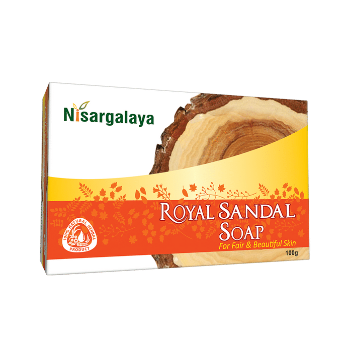 Nisargalaya Royal Sandal Soap is made from pure sandalwood oil and is soft on the skin. It makes the skin supple and moisturized. Your body will have a golden glow and smell amazing. The sandalwood oil is a natural moisturizer; it keeps the skin from drying and also from becoming too oily. Nisargalaya Royal Sandal Soap has a unique, woody, sweet and warm fragrance that is distinctly noticeable. It has medicinal qualities preventing body odor. It also has anti-ageing benefits and is known to reduce fine lines, tighten the skin and rejuvenate skin cells. You feel firmer within weeks of use. Daily use of Nisargalaya Royal Sandal Soap in the hot shower is an excellent way to reduce stress, release tension and calm your thoughts. | Key Ingredients: Chandana taila Narikela Chandana Glycerin | Key Benefits: Moisturizer: Nisargalaya Royal Sandal Soap is made from pure sandalwood oil, is soft on the skin and leaves it supple and moisturized. Your body will have a golden glow and smell amazing. The sandalwood oil is a natural moisturizer, it keeps the skin from drying and also from becoming too oily Prevents Body Odor: Nisargalaya Royal Sandal Soap has a unique, woody, sweet and warm fragrance that is distinctly noticeable. It has medicinal qualities preventing body odor Anti-ageing benefits: Nisargalaya Royal Sandal Soap has anti-ageing benefits as sandalwood is known to reduce fine lines, tighten the skin and rejuvenate skin cells. You feel firmer within weeks of use Reduces stress: Daily use of Nisargalaya Royal Sandal Soap in the hot shower is very good to reduce stress, release tension and calm your thoughts. Many people also wash their face with this soap at work to feel fresher and less stressed Reduces Itchiness: Nisargalaya Royal Sandal Soap is the perfect remedy for itchy skin, especially in winters. The soap is gentle on the skin and relieves it from itchiness. Its oils not only heal itchy areas but also helps your skin from drying. Itchiness can be due to an allergy as well No acne marks and reduces scars: Nisargalaya Royal Sandal Soap works wonder on acne-prone skin, reduces scars and control oil Evens out skin tone: Sandalwood, because of its antimicrobial qualities, prevents suntan, heals the skin and restores its health Big on antiseptic properties: Nisargalaya Royal Sandal Soap is an antiseptic soap. It can help to cure ringworms, boils, athlete’s foot, rashes, blackheads, minor cuts, etc. Just simply washing off the affected area with sandalwood soap every day will show you results | Directions For Use: Use as directed. | Safety Information: Read the label carefully before use Store in a cool and dry place away from direct sunlight Keep out of reach of children