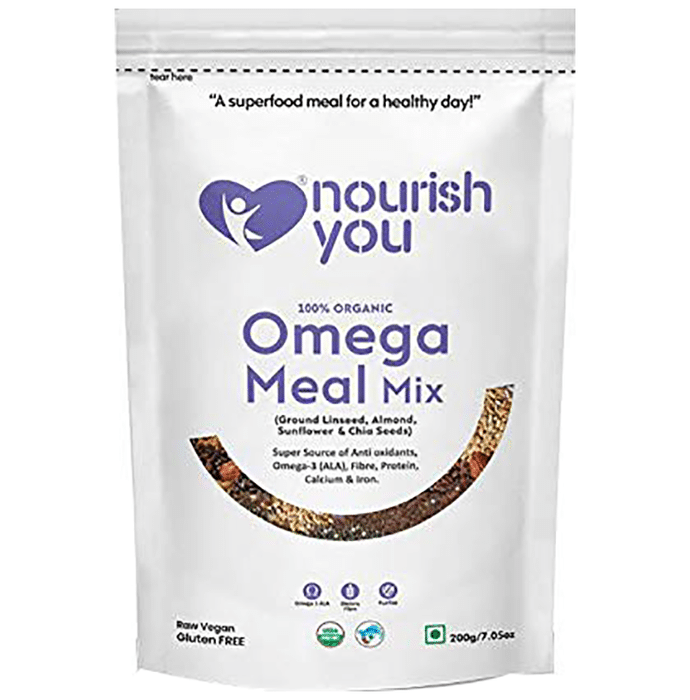 Nourish You 100% Organic Omega Meal Mix Nourish You 100% Organic Omega Meal Mix helps you start your day with a premium gourmet blend of ground linseeds, sunflower seeds, chia seeds and almonds that adds crunch, flavour and goodness to any meal of the day. It’s an excellent source of antioxidants. It provides fibre that benefits digestive health, protein for growth of muscle mass and contains essential omega- 3,6,9.